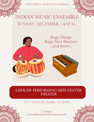 The South Alabama Indian Music Ensemble invites you to a concert on Sunday, December 7 at 5:00 p.m. in the Laidlaw Performing Arts Center Drama Mainstage Theatre. Spread the word! The program features compositions in Raga Durga, Raga Ahir Bhairav and the work of Rabindranath Tagore accompanied by authentic Indian classical instruments. The ensemble is directed by Dr. S. Raj Chaudhury.