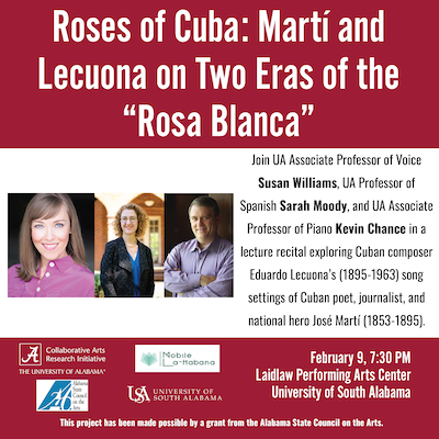 The University of South Alabama is proud to co-host this Guest Lecture Recital entitled "Roses of Cuba: Martí and Lecuona on Two Eras of the 'Rosa Blanca.'" The event explores Cuban composer Eduardo Lecuona (1895-1963) and his song settings of Cuban poet, journalist, and national hero José Martí (1853-1895). the guest faculty come from the University of Alabama and include associate professor of voice Susan Williams, associate professor of Spanish Sarah Moody, and associate professor of piano Kevin Chance.