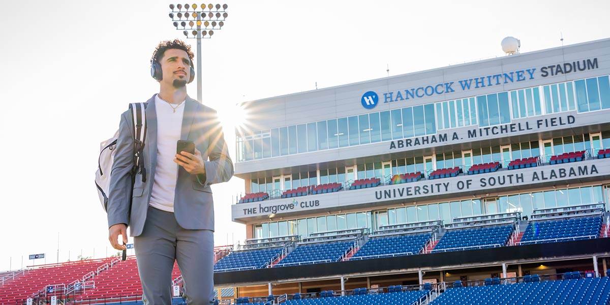 The first home game for Jaguars wide receiver Devin Voisin ’24 wasn’t at “home.” The 37-14 victory over Jackson State was actually at Ladd-Peebles Stadium, seven miles from the University of South Alabama campus.